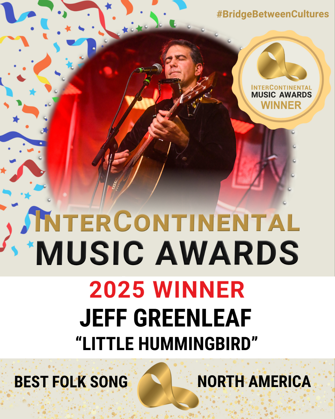 Jeff’s song “Little Hummingbird” won the 2025 InterContinental Music Awards, representing North America for Best Folk Song.